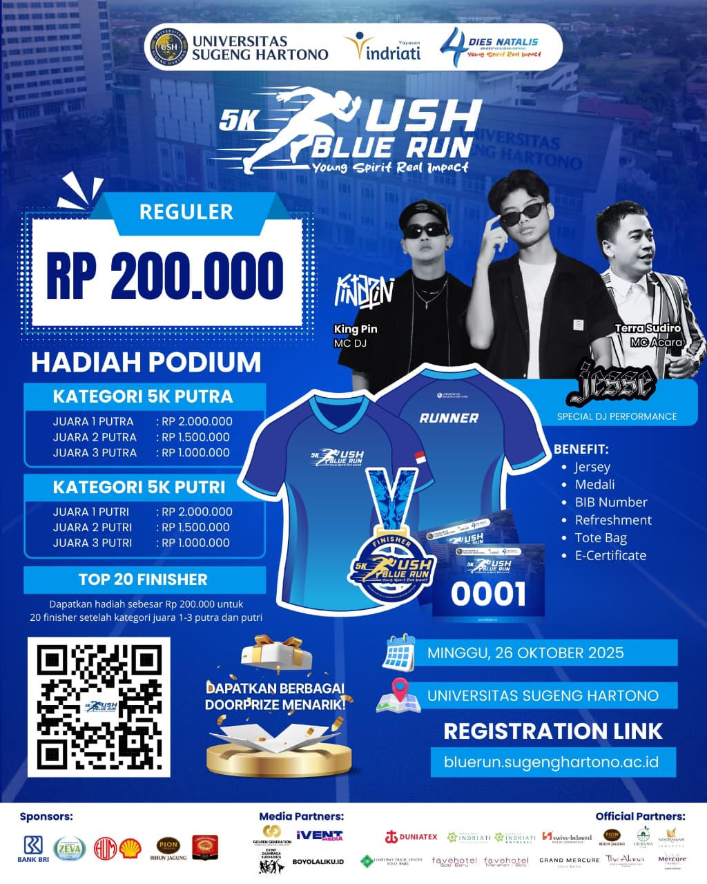 Letβs celebrate youth spirit and healthy living in the 5K USH Blue Run, a special event to commemorate the 4th Dies Natalis of Universitas Sugeng Hartono!
