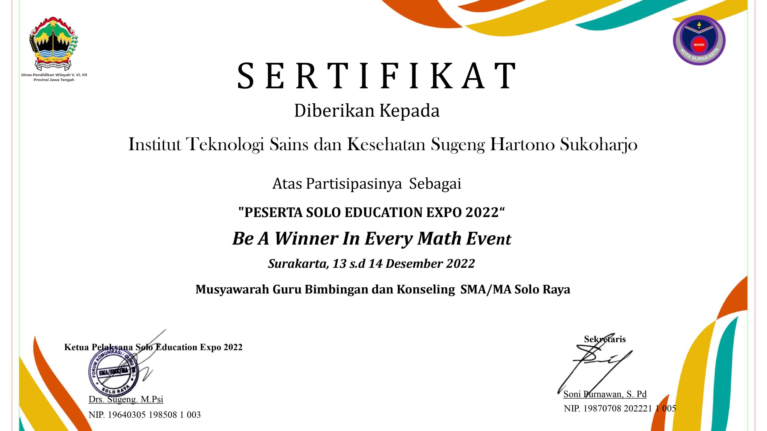 Terima kasih kami ucapkan kepada seluruh Panitia Solo Education Expo 2022 “Be A Winner in Every Math Event” atas kepercayaannya Institut Teknologi Sains dan Kesehatan Sugeng Hartono diberi kesempatan untuk bergabung dalam mensukseskan acara tahunan EXPO MGBK Solo Raya.